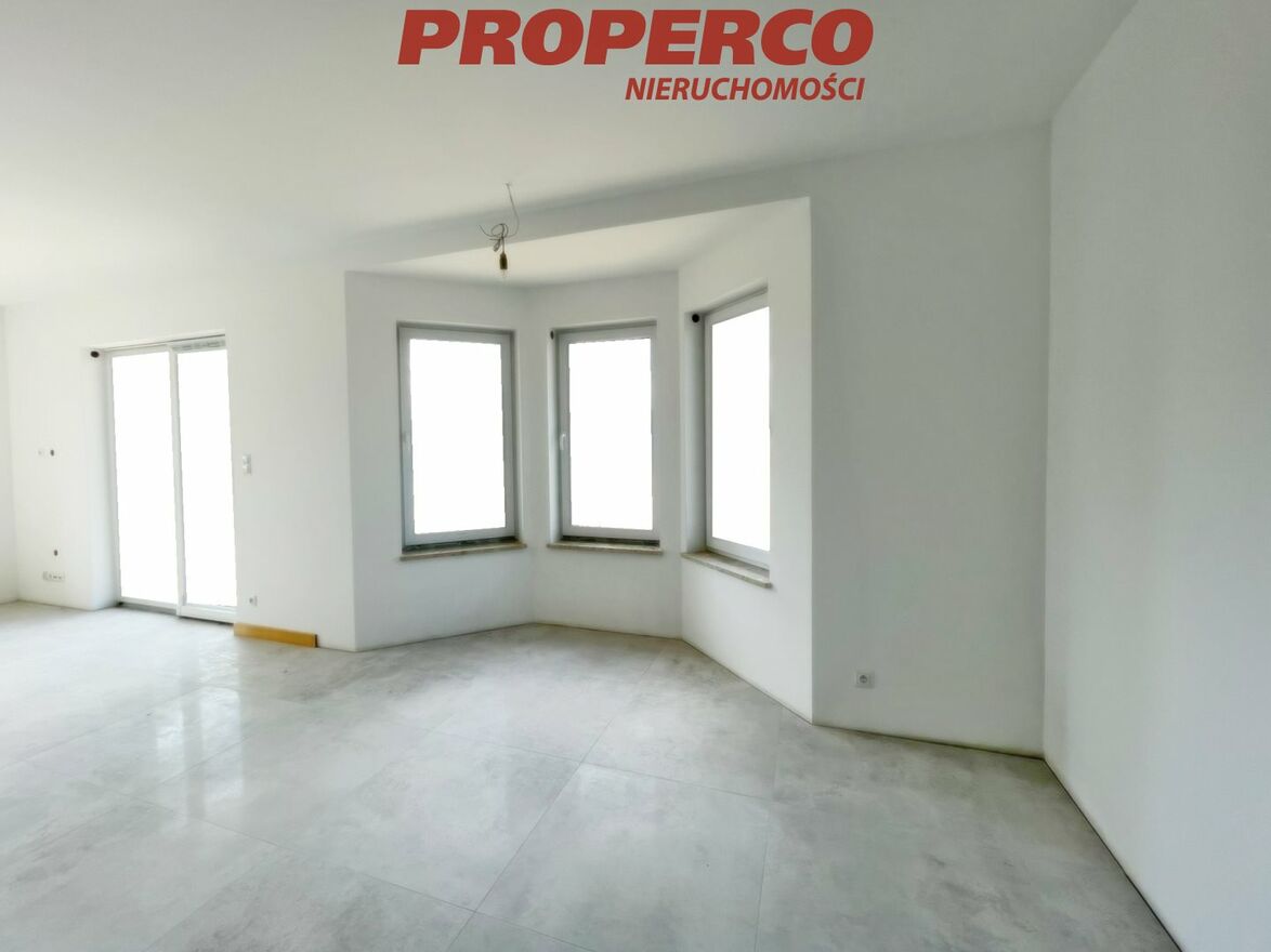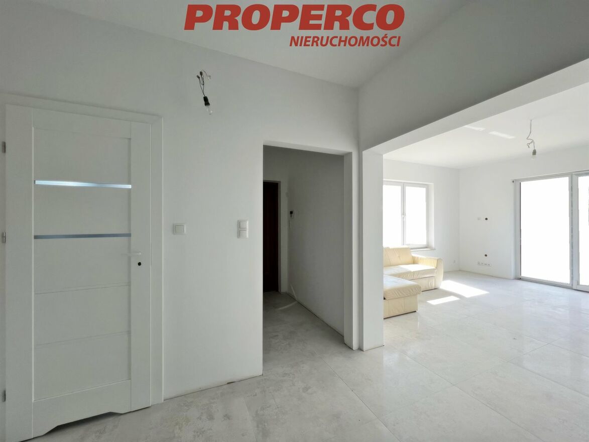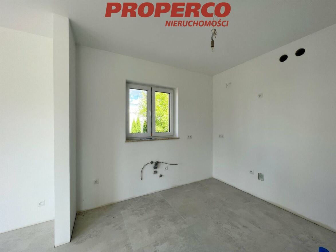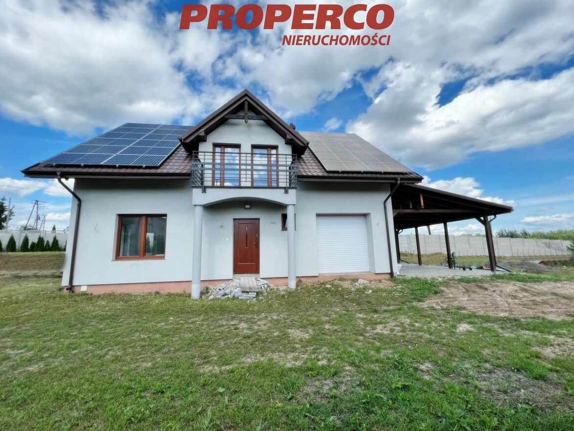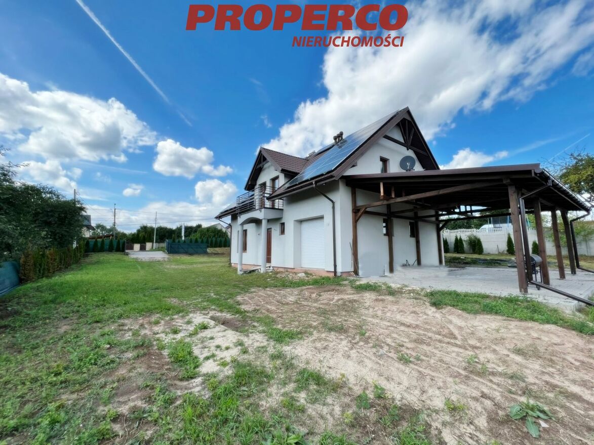 For sale, a detached house with a usable area of approximately 122.80 m2 (total area approximately 184 m2 ), located on a plot of land with an area of 11,815 m2 in Radkowice, in the municipality of Chęciny. The construction started in 2020 and was completed in 2023, according to the "Dom w Aksamitkach 2" project.