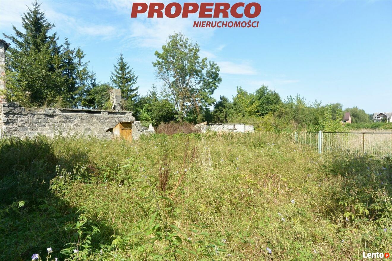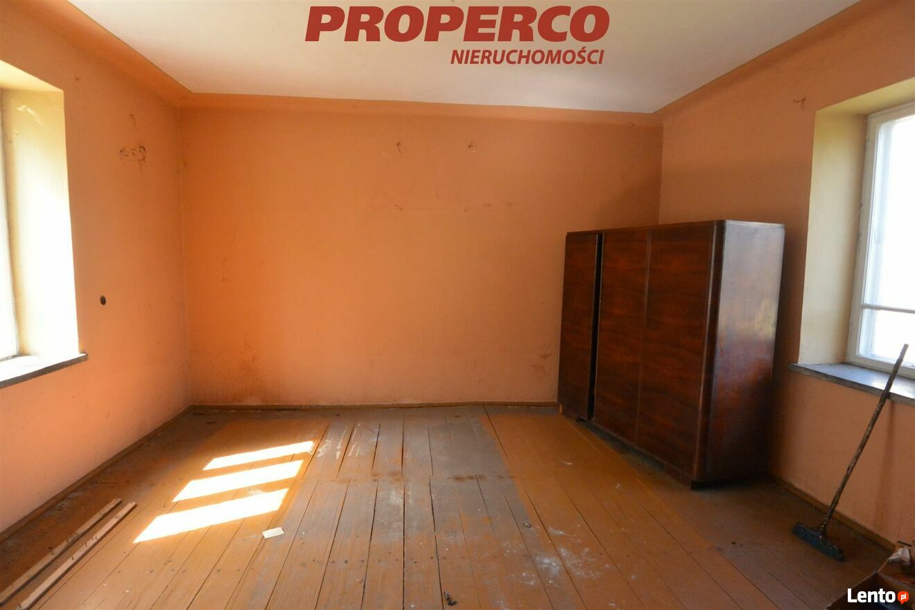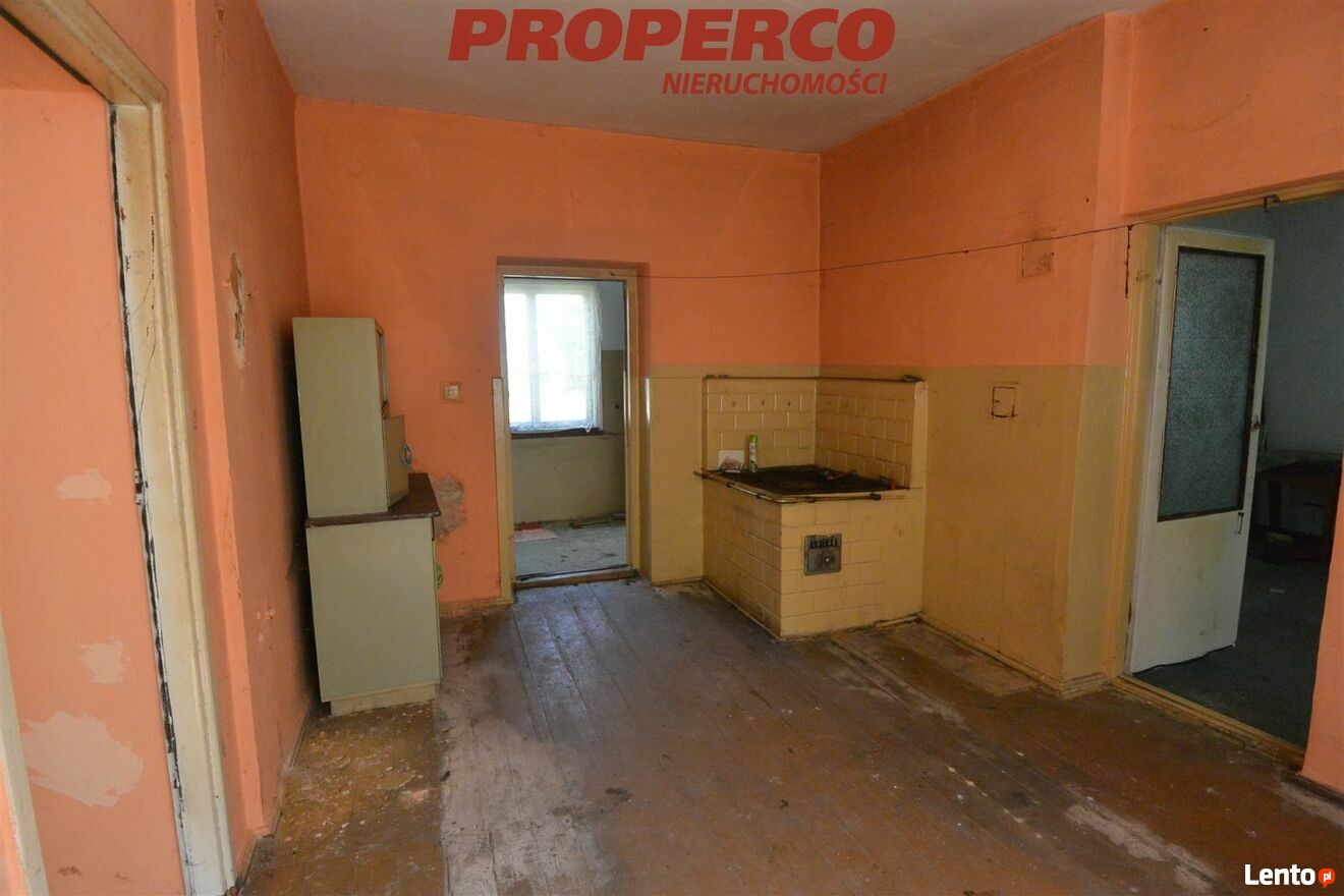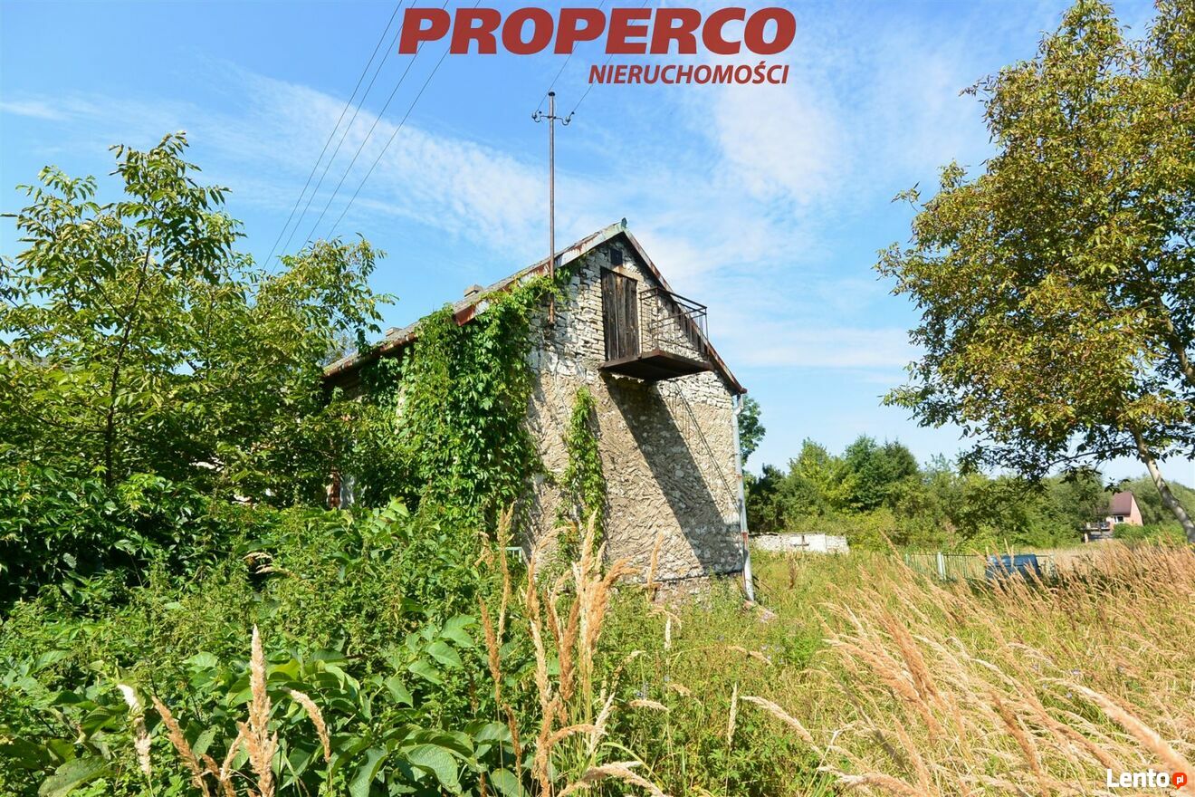 Działka zabudowana wolnostojącym, parterowym domem o pow. około 50 m2 (przeznaczonym do rozbiórki lub generalnego remontu) oraz budynki gospodarcze. Budynek mieszkalny zbudowany w latach 50, murowany, dach kryty eternitem, ogrzewany piecem kaflowym. Składa się z dwóch pokoi, kuchni, przedsionka i ganku.
